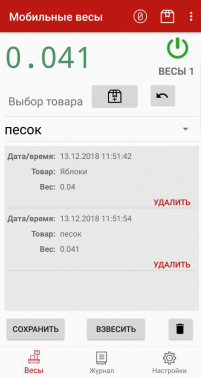 • Собственная база данных SQLite, позволяющая хранить совершенные взвешивания